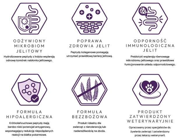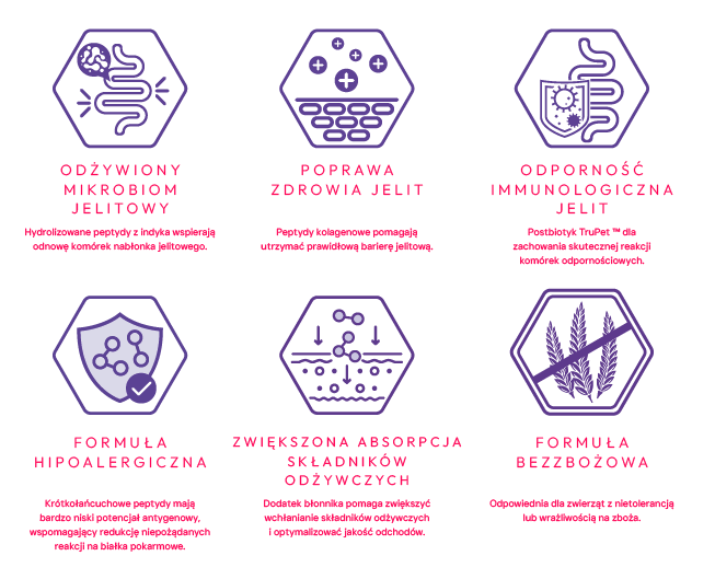 Świeżo przygotowany hydrolizowany indyk (40%), ziemniaki, hydrolizowany suszony łosoś (15%), groszek, tłuszcz z indyka (5%), celuloza, hydrolizowany sos wątrobowy (2%), minerały, fruktooligosacharydy (FOS, 2310 mg/kg), mannooligosacharydy (MOS, 960 mg/kg), nagietek (źródło luteiny).